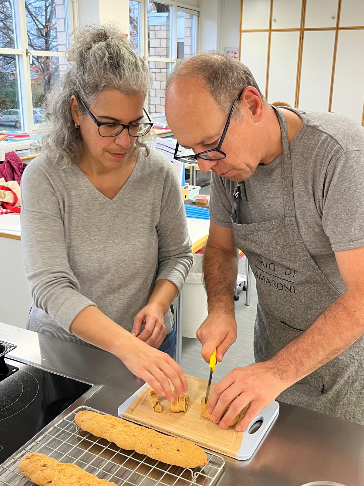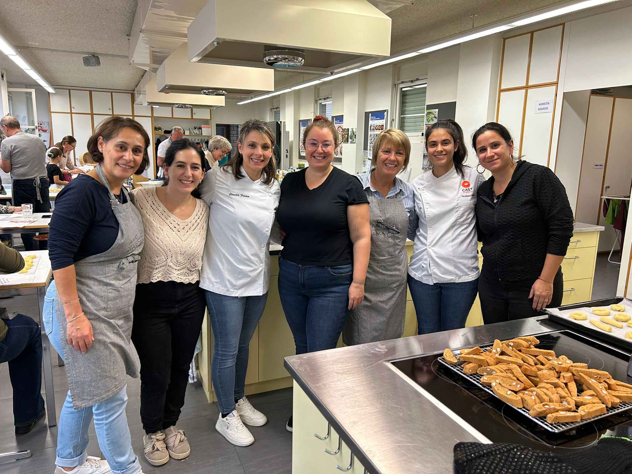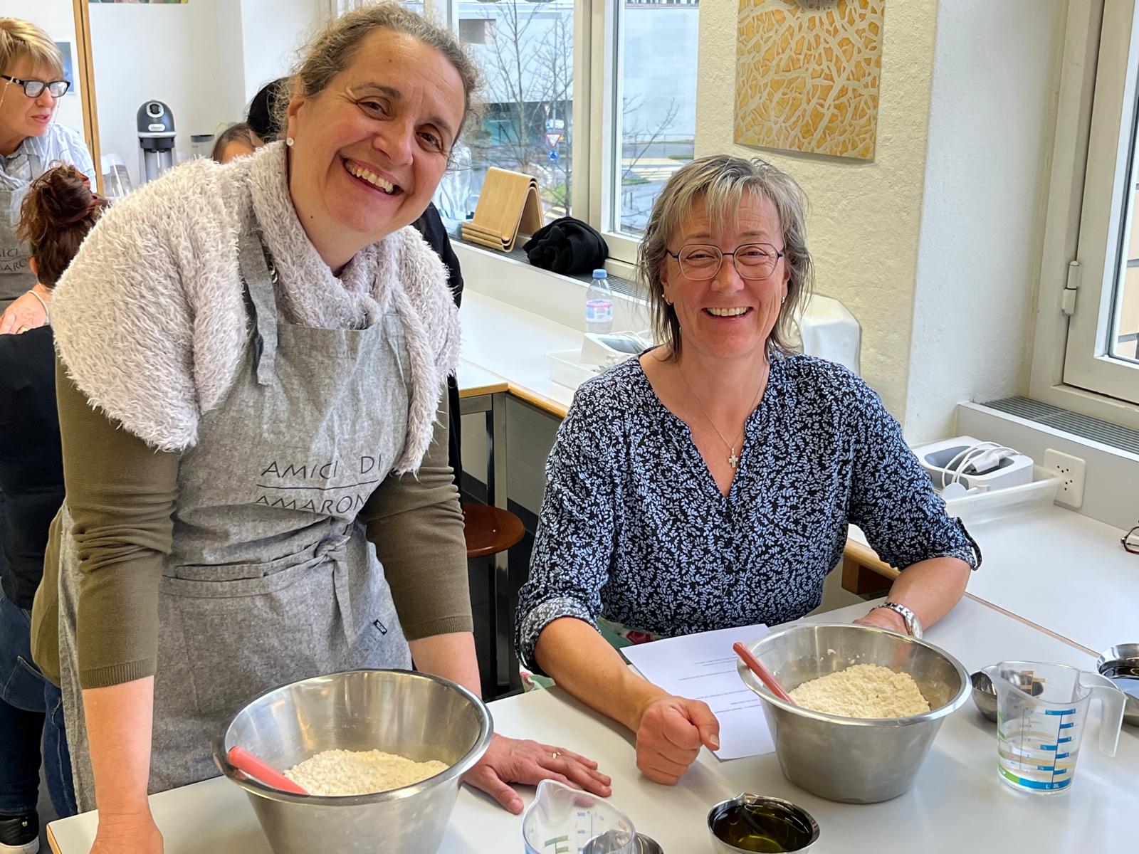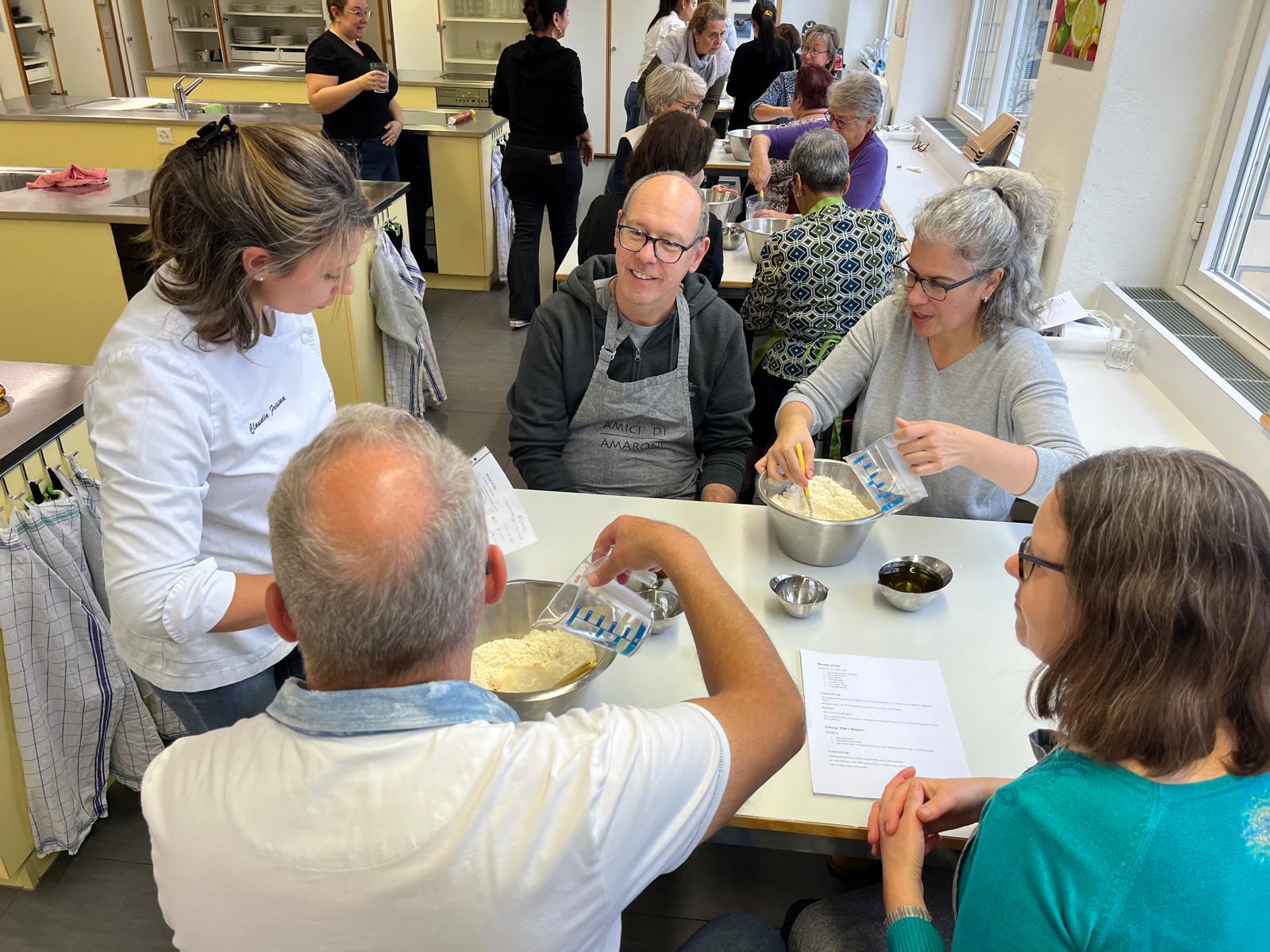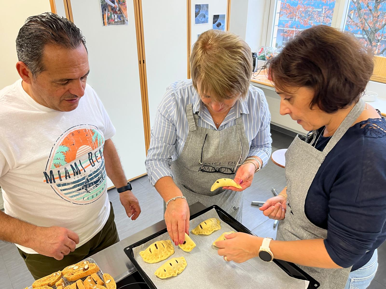 Ende August 2025 nutzten Enrico und ich die Gelegenheit, bei einem Treffen mit Claudia kurzfristig einen Backkurs zu organisieren. Die Idee bestand darin, amaronesische Spezialitäten zu backen. Dafür benötigten wir viel Know-how – und wer wüsste das besser als unsere Claudia und Valentina Frisina aus Oberentfelden? Claudia und Valentina stammen beide aus Amaroni und haben vor sechs Jahren in Oberentfelden ihre Arte Pasticcera gegründet. Kurzentschlossen und sehr schnell fixierten wir ein Datum und versendeten unmittelbar danach die Einladung an unsere Mitglieder. Es war ein Probelauf, und wir wussten nicht, wie der Anlass ankommen würde. Die Kochküche war für 15 Teilnehmende ausgelegt, was wir auch entsprechend kommunizierten. Bereits nach wenigen Tagen waren alle Plätze ausgebucht, sodass wir den Anlass gar nicht mehr öffentlich bewerben mussten. Claudia und Valentina hatten den Kurs grossartig vorbereitet und zauberten an diesem Samstag gemeinsam mit uns, drei verschiedene Backspezialitäten. Innerhalb von drei Stunden gelang scheinbar das Unmögliche. Alle 15 Teilnehmenden machten mit grosser Begeisterung, Teamgeist und viel Freude mit und wir erhielten zahlreiche positive Rückmeldungen. Das Backen mit Claudia und Valentina war geprägt von Harmonie, Leidenschaft und echtem Handwerk – ein kulinarisches Zusammenspiel, das man schmecken und spüren konnte.